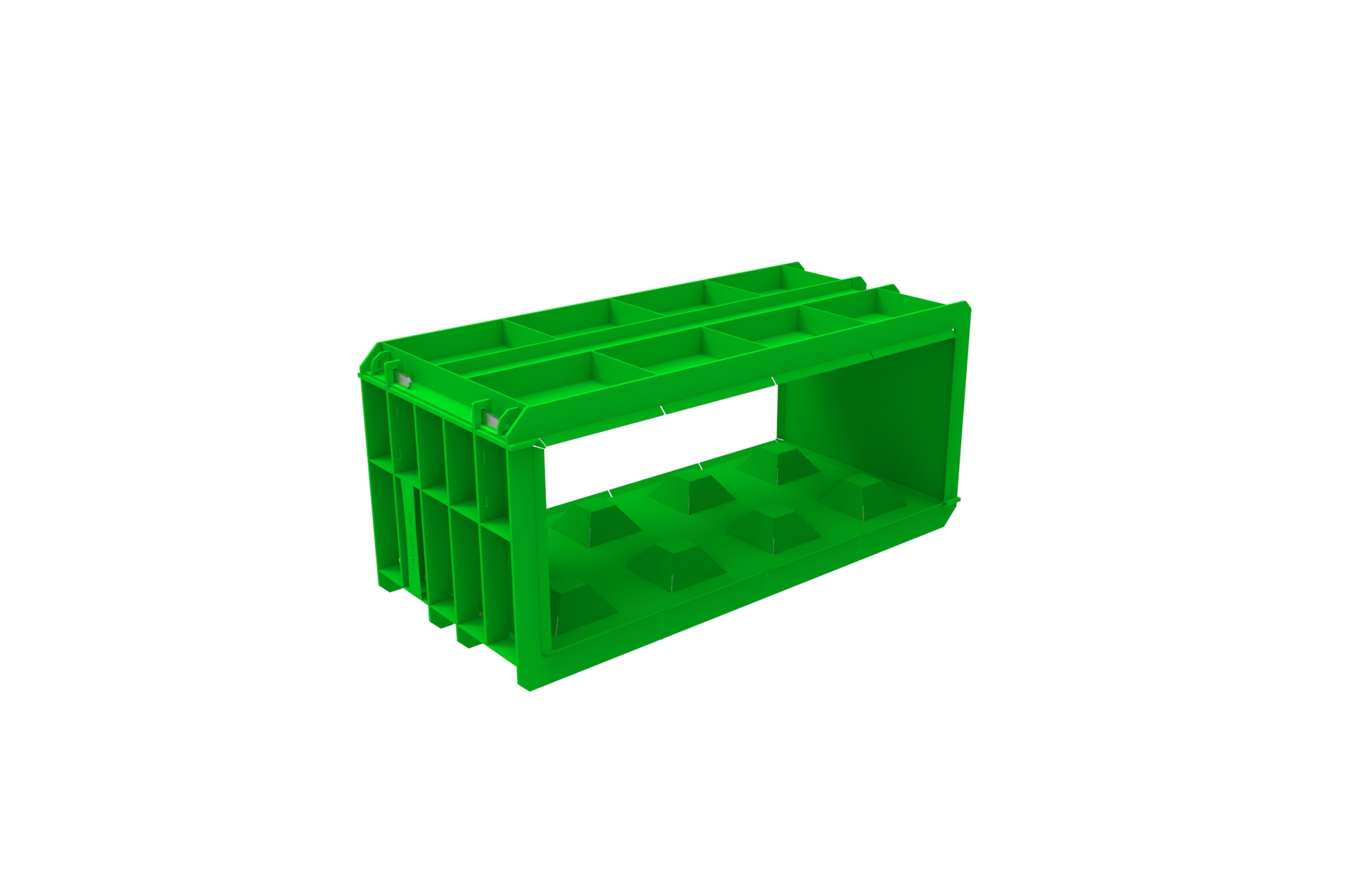 Form für flache Betonblocksteine F-160/80/60 P gefertigt aus Baustahl, entwickelt zum Gießen von Betonblöcken, geöffnet mit einem Schlüssel.