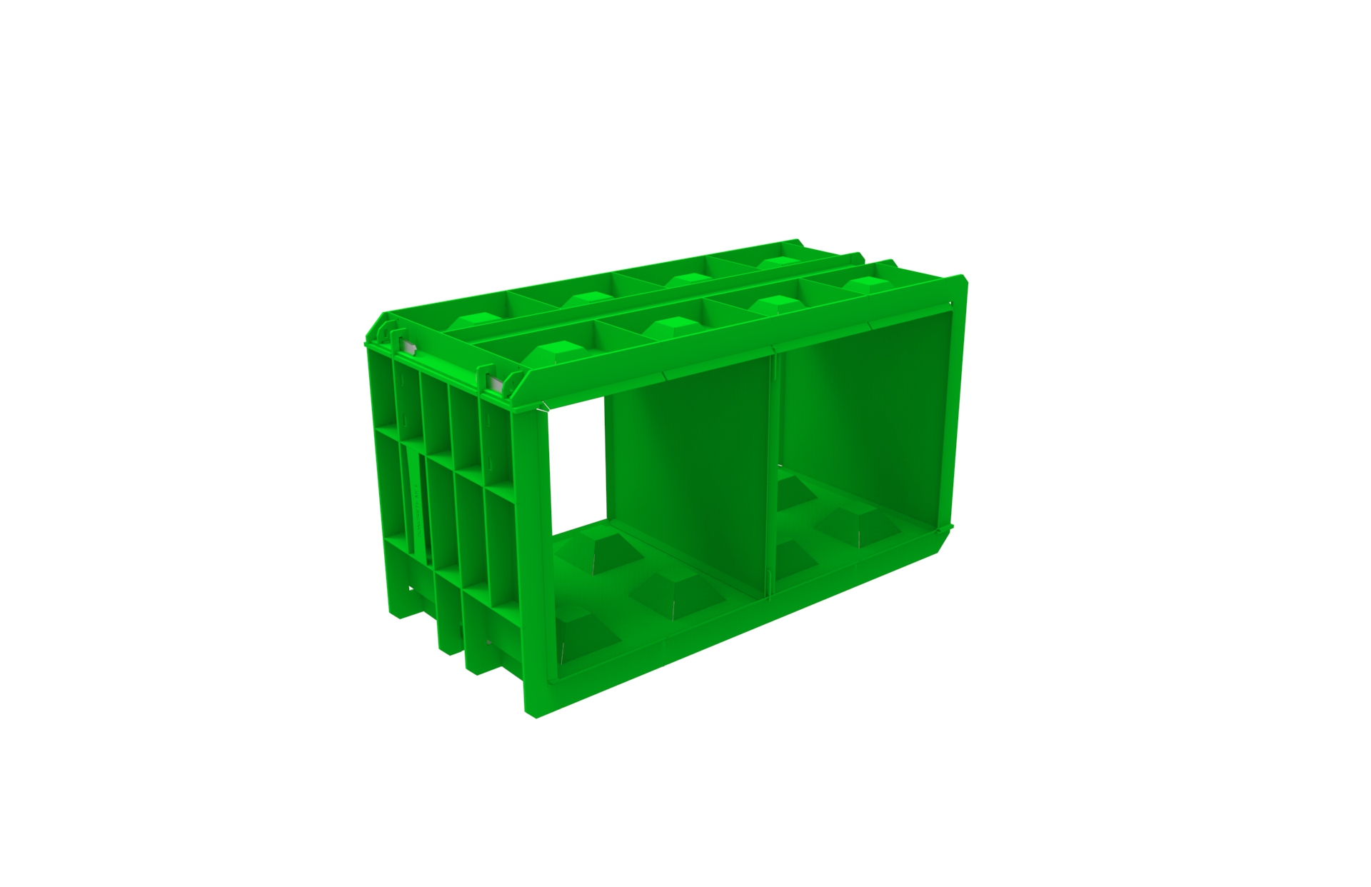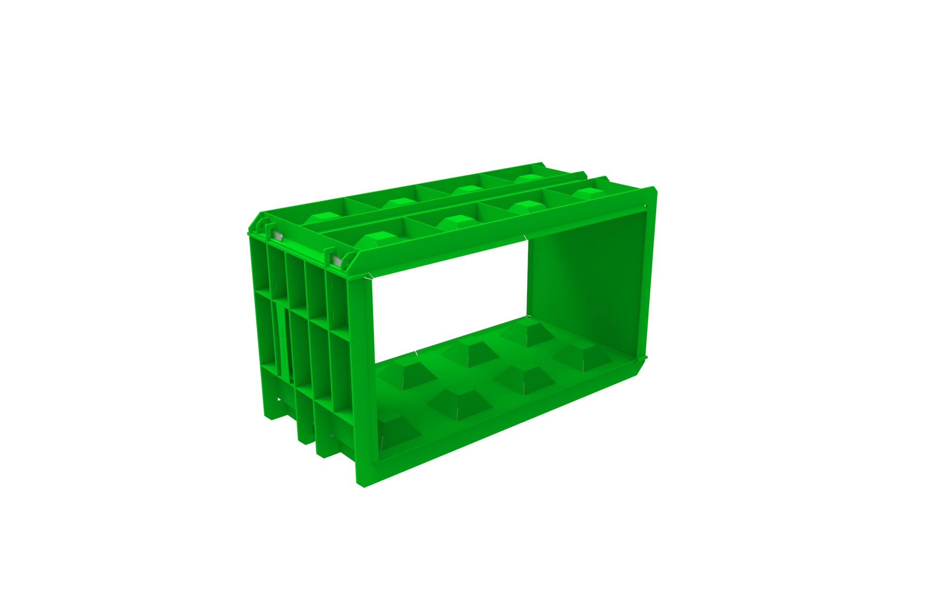 Form für Betonblocksteine F-160/80/80 gefertigt aus Baustahl, entwickelt zum Gießen von Betonblöcken, geöffnet mit einem Schlüssel.