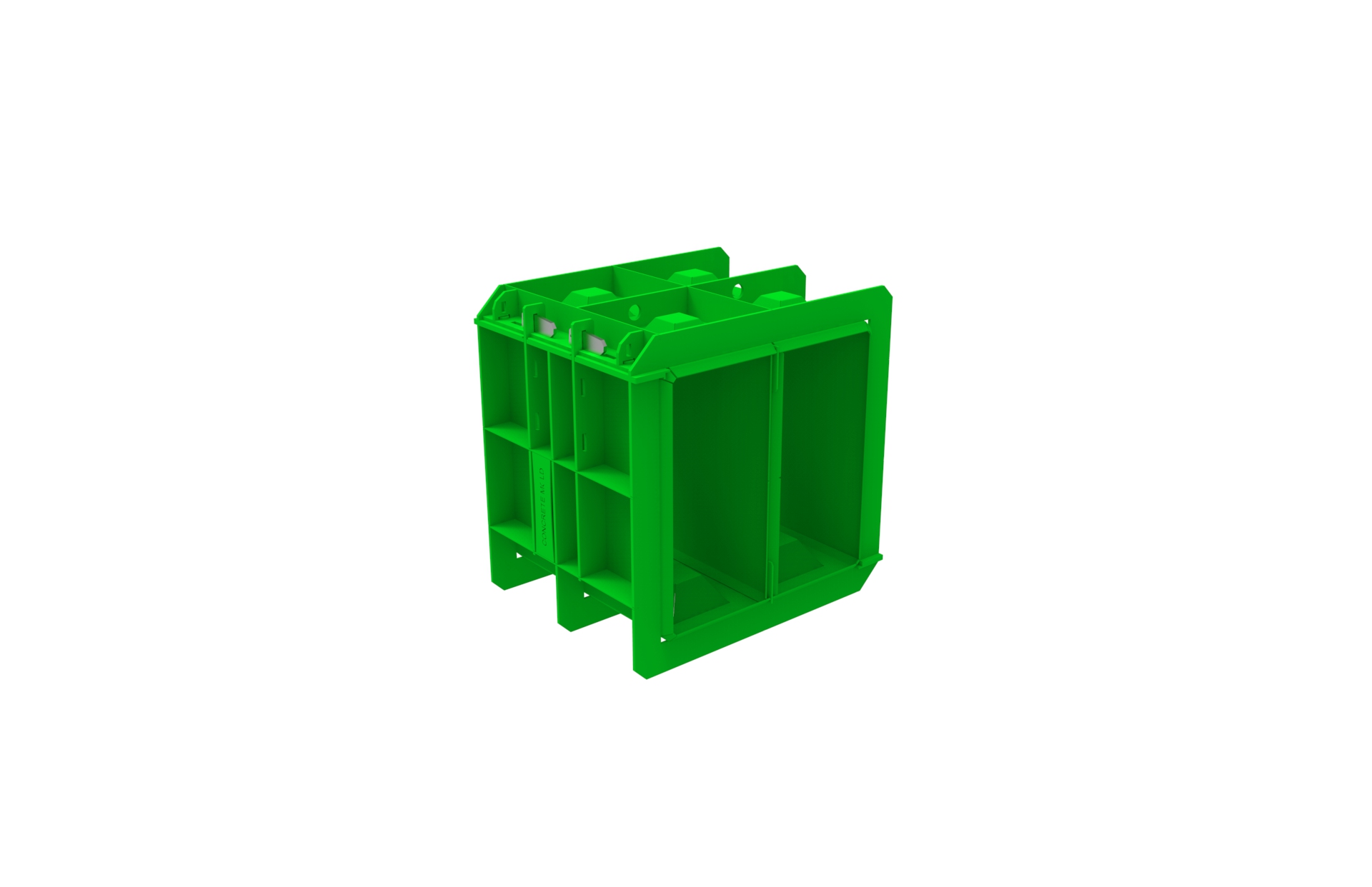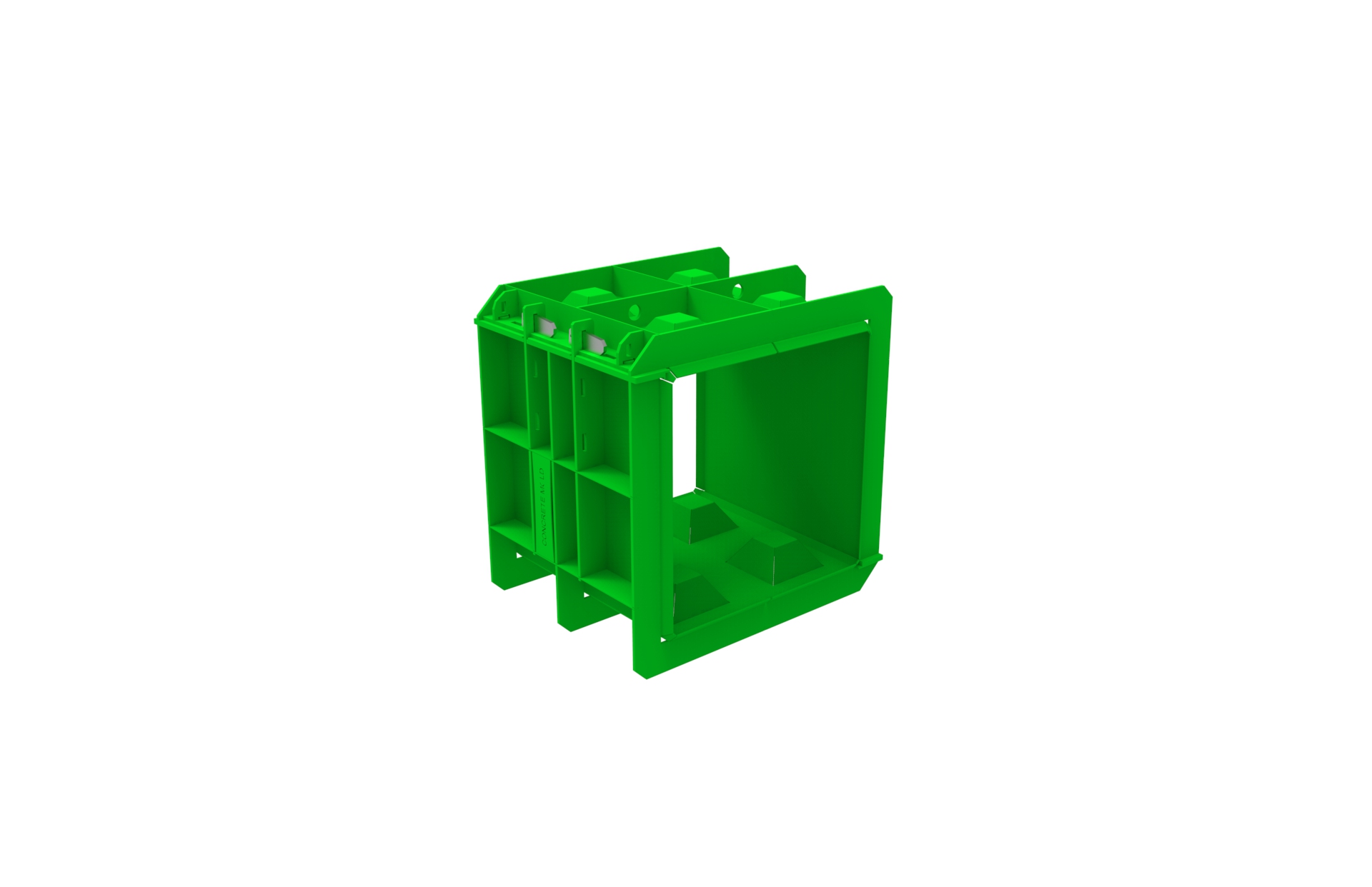 Form für Betonblocksteine F-60/60/60 gefertigt aus Baustahl, entwickelt zum Gießen von Betonblöcken, geöffnet mit einem Schlüssel.